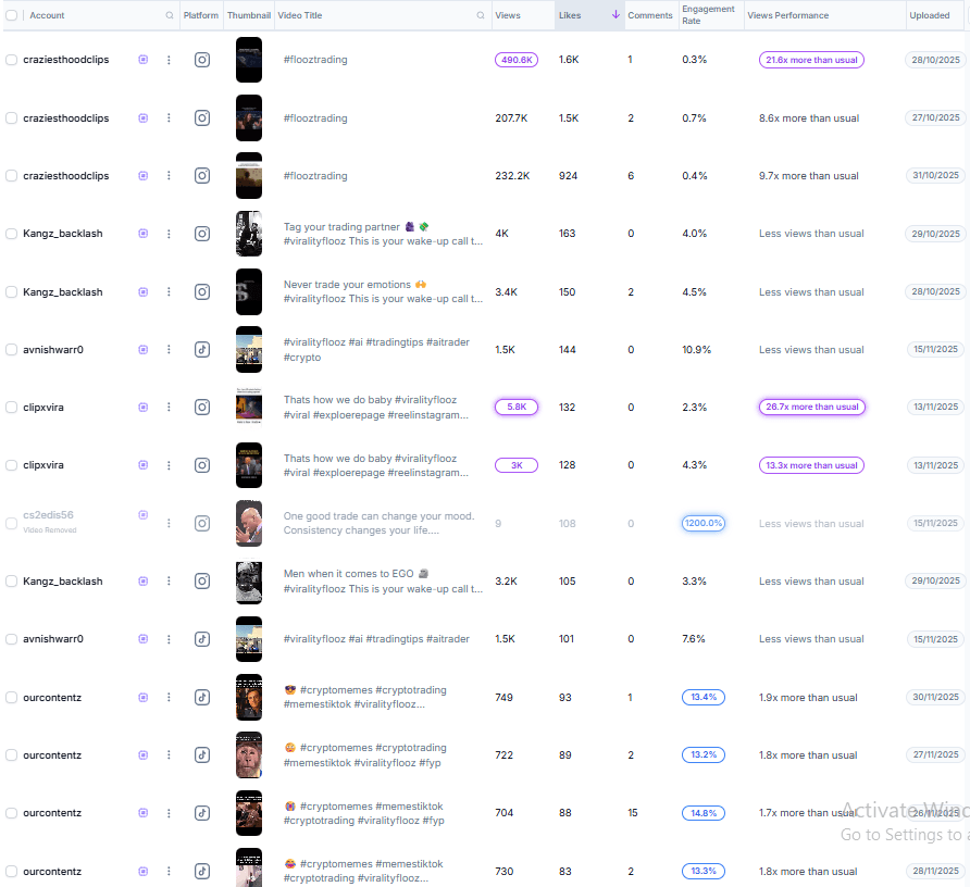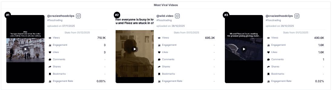 Multiple videos crossed the 200K–700K view range, showing strong viral potential for Flooz content.