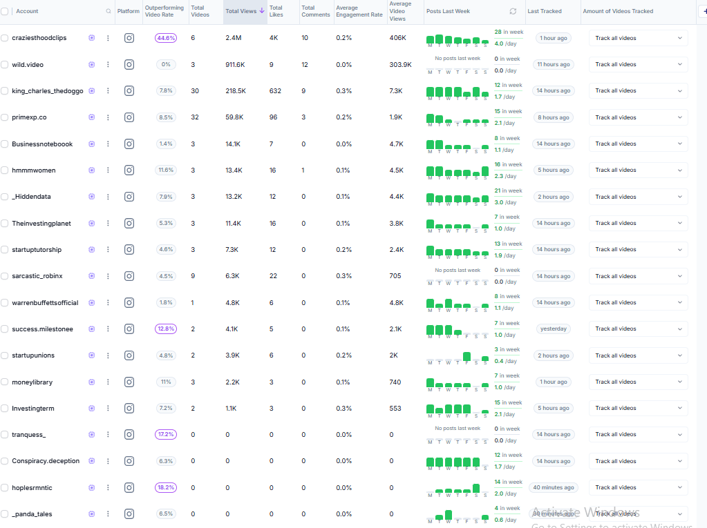 Note: Some videos did not appear in the dashboard export even though they were tracked live — actual high-performers are slightly higher than the list shows.
