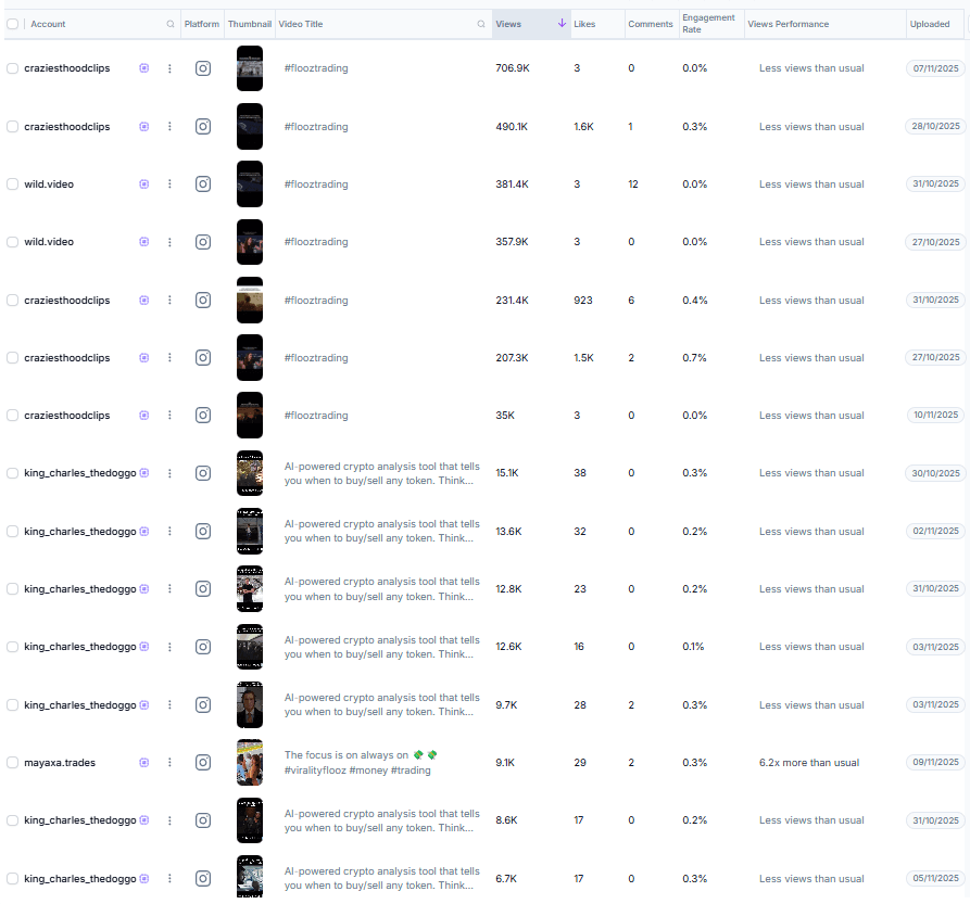 These accounts contributed the majority of view volume, with @craziesthoodclips emerging as the top viral driver and @wild.video maintaining strong reach consistency.