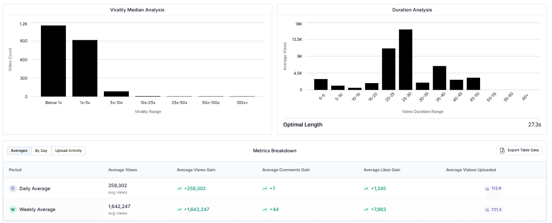 Most videos performed within the 1×–5× virality range, with spikes up to 10× for standout uploads.Optimal Duration: