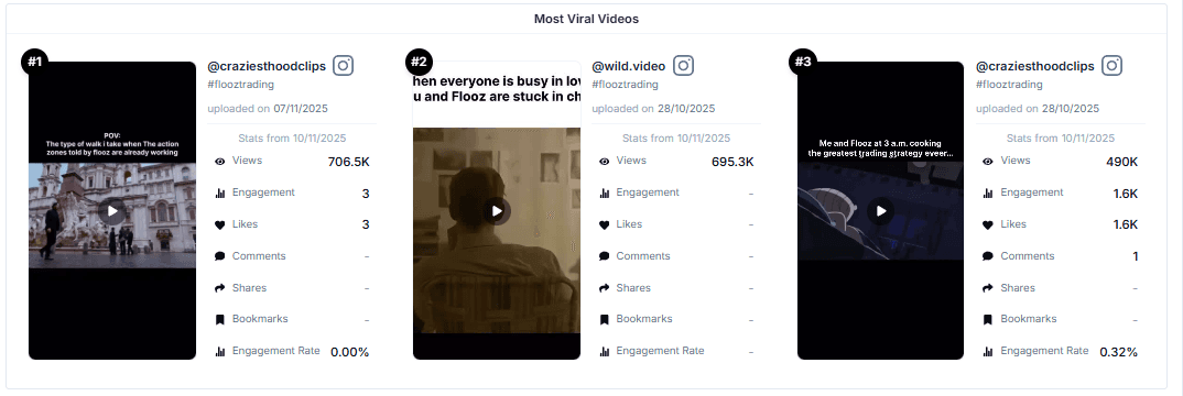 Although engagement ratios were low on some uploads, the campaign’s reach and viral traction were strong — particularly within slideshow and meme-style edits. The engagement pattern suggests broad awareness reach rather than niche community interaction.