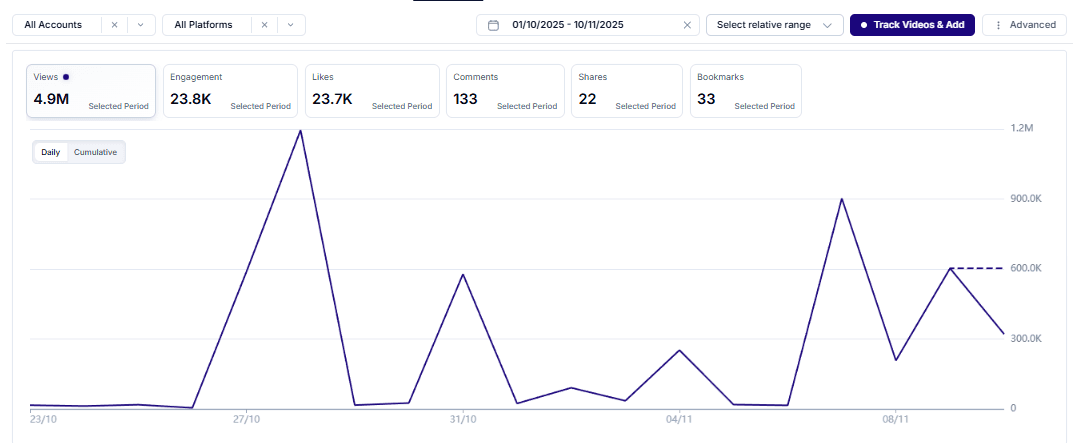 The campaign achieved solid multi-account performance, generating nearly 5 million total views with consistent daily engagement peaks throughout late October and early November.