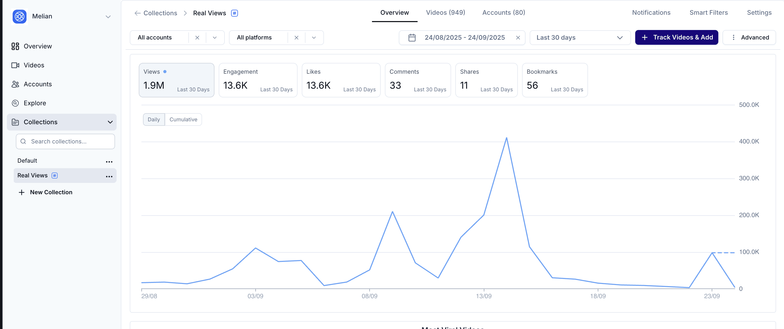 The Real Views tracked collection on shortimize indicates a generated 1.9 million total views across all tracked accounts and platforms.