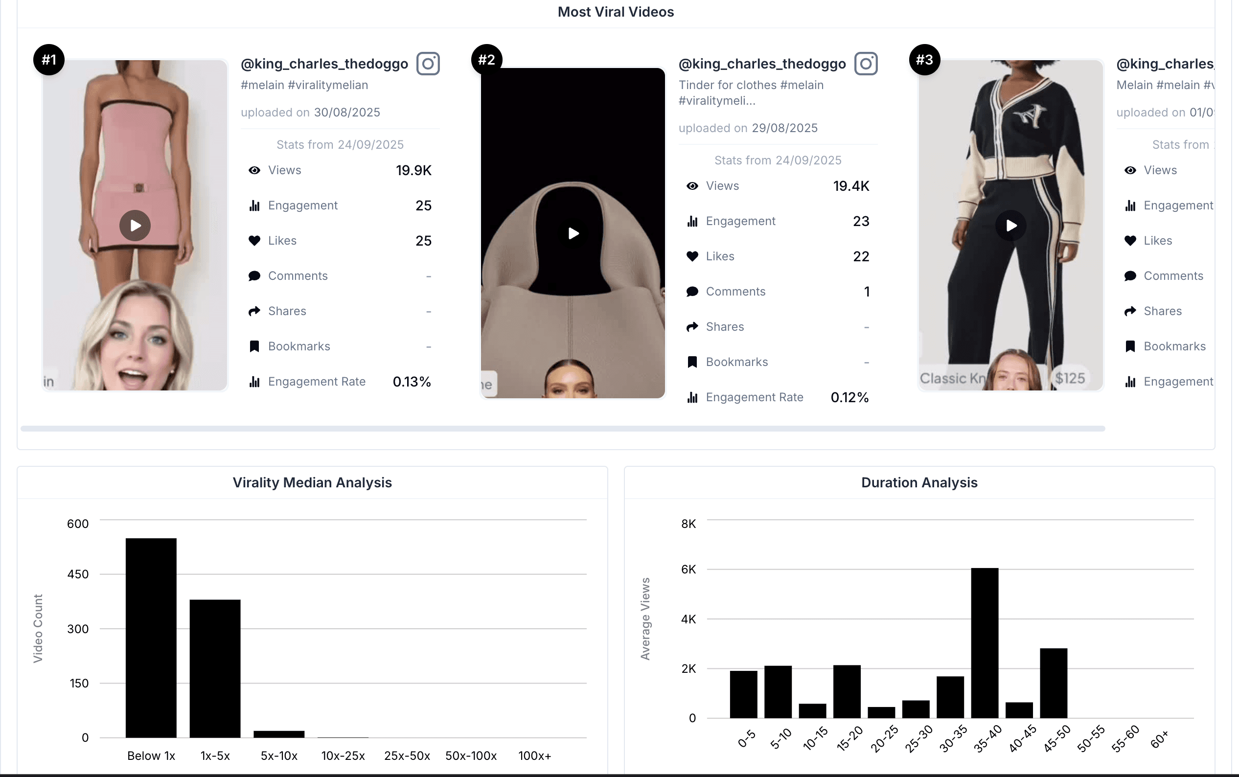 Viral content reached between 15,700 and 19,900 views per video with engagement rates ranging from 0.08% to 0.19%. Videos between 35 and 40 seconds showed optimal performance. Most content performed at or below 1x baseline virality.