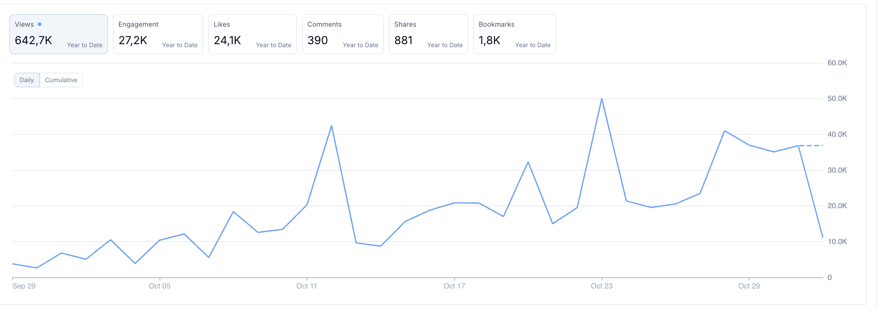 The campaign showed steady growth throughout October, with consistent daily engagement peaks aligning with viral video drops.