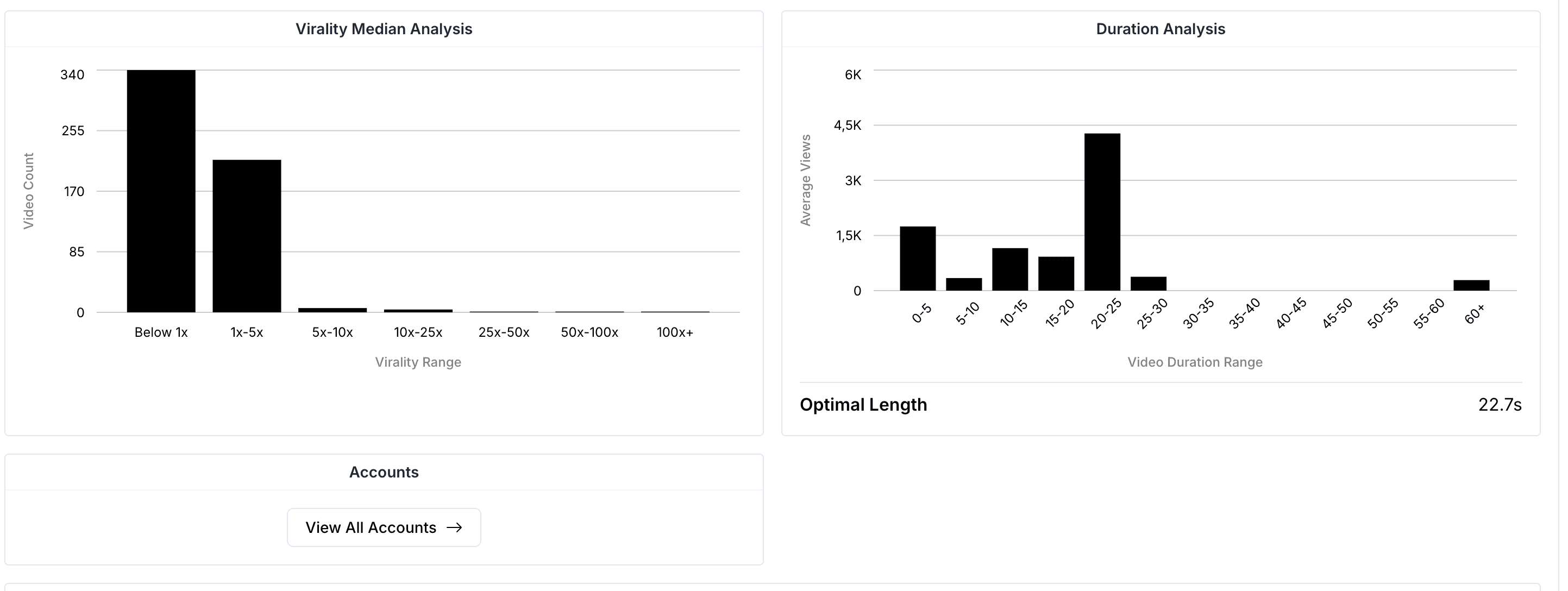 The best-performing clips averaged 22.7 seconds. Videos within the 20–25 second range reached the highest average views (around 4.5K).