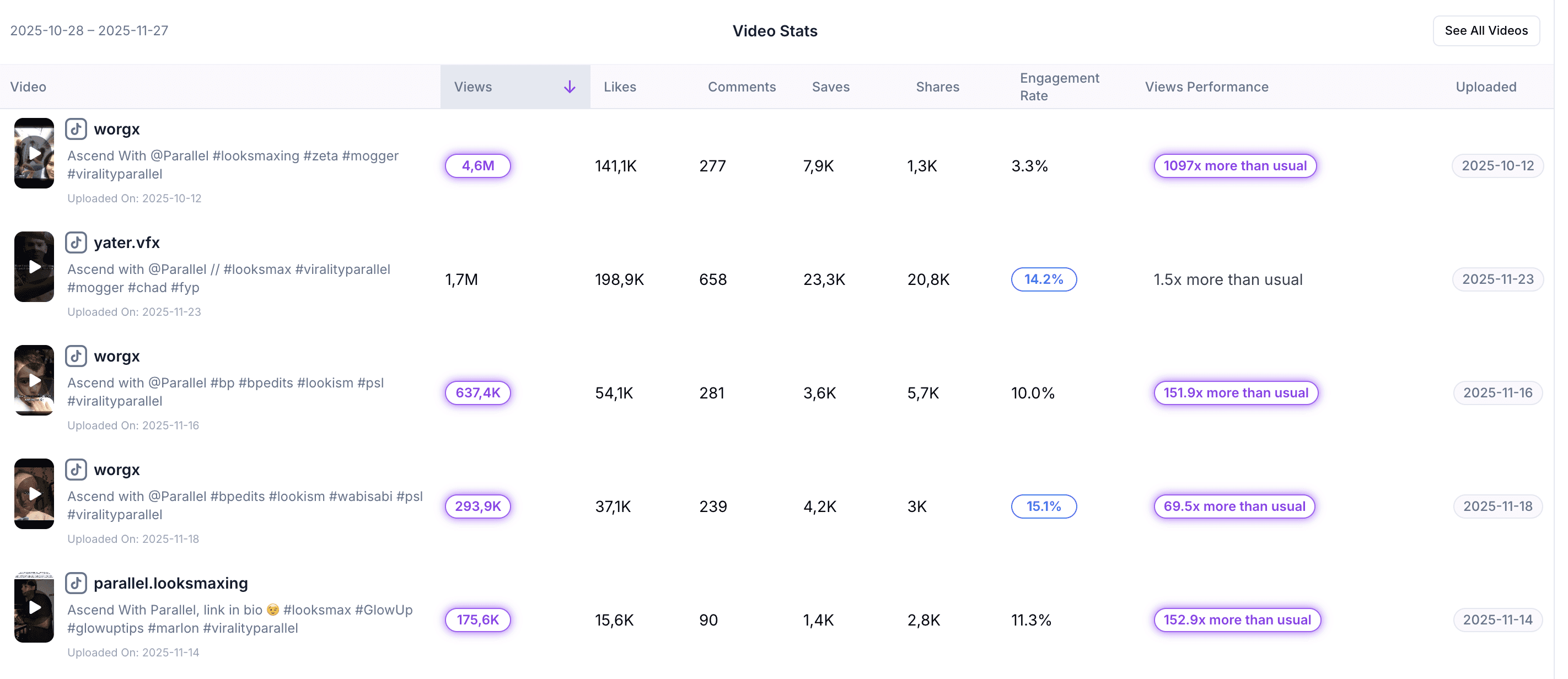 These accounts contributed the majority of view volume, with @yater.vfx emerging as the top conversion driver and @worgx maintaining strong reach consistency.