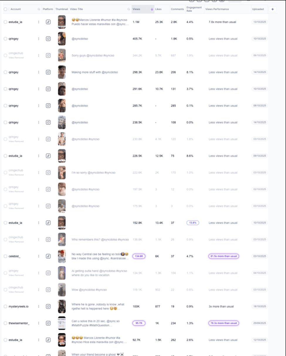 Engagement-heavy videos (4–13% ER) typically featured short dialogue hooks or relatable humor themes — especially those tagged with #syncd or #iahumor.