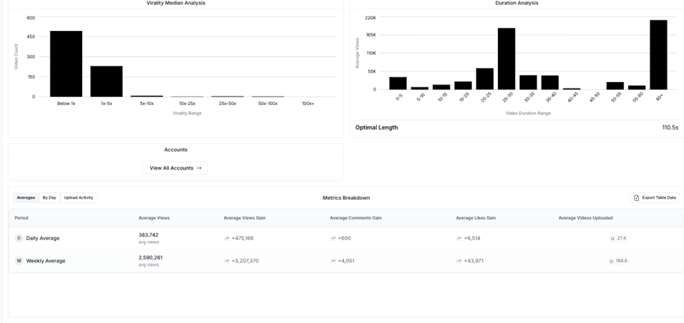Sustained upload volume (25–30 videos/day) contributed to consistent visibility and trend adaptation.