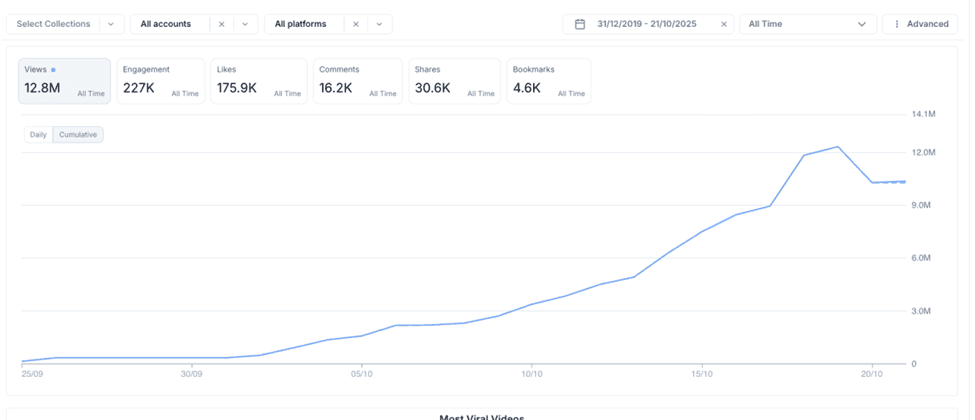 The campaign showed steady and consistent growth, peaking around mid-October before stabilizing near 12.8M total views.